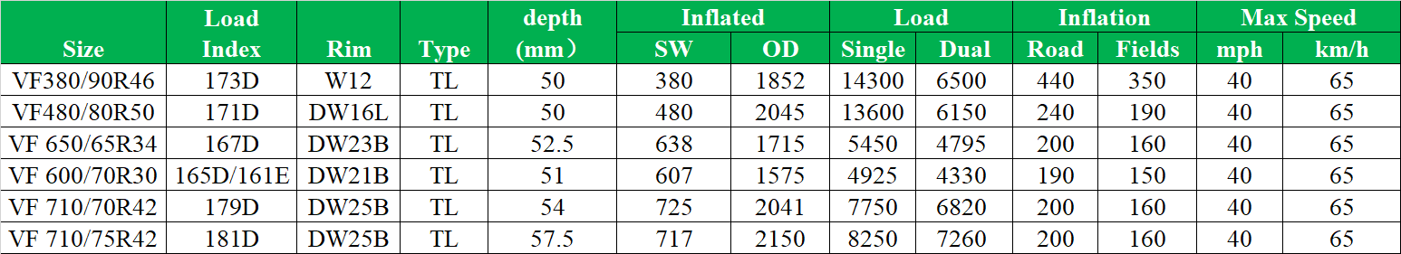 VF380/90R46 VF480/80R50 VF 650/65R34 VF 600/70R30 VF 710/70R42 VF 710/75R42